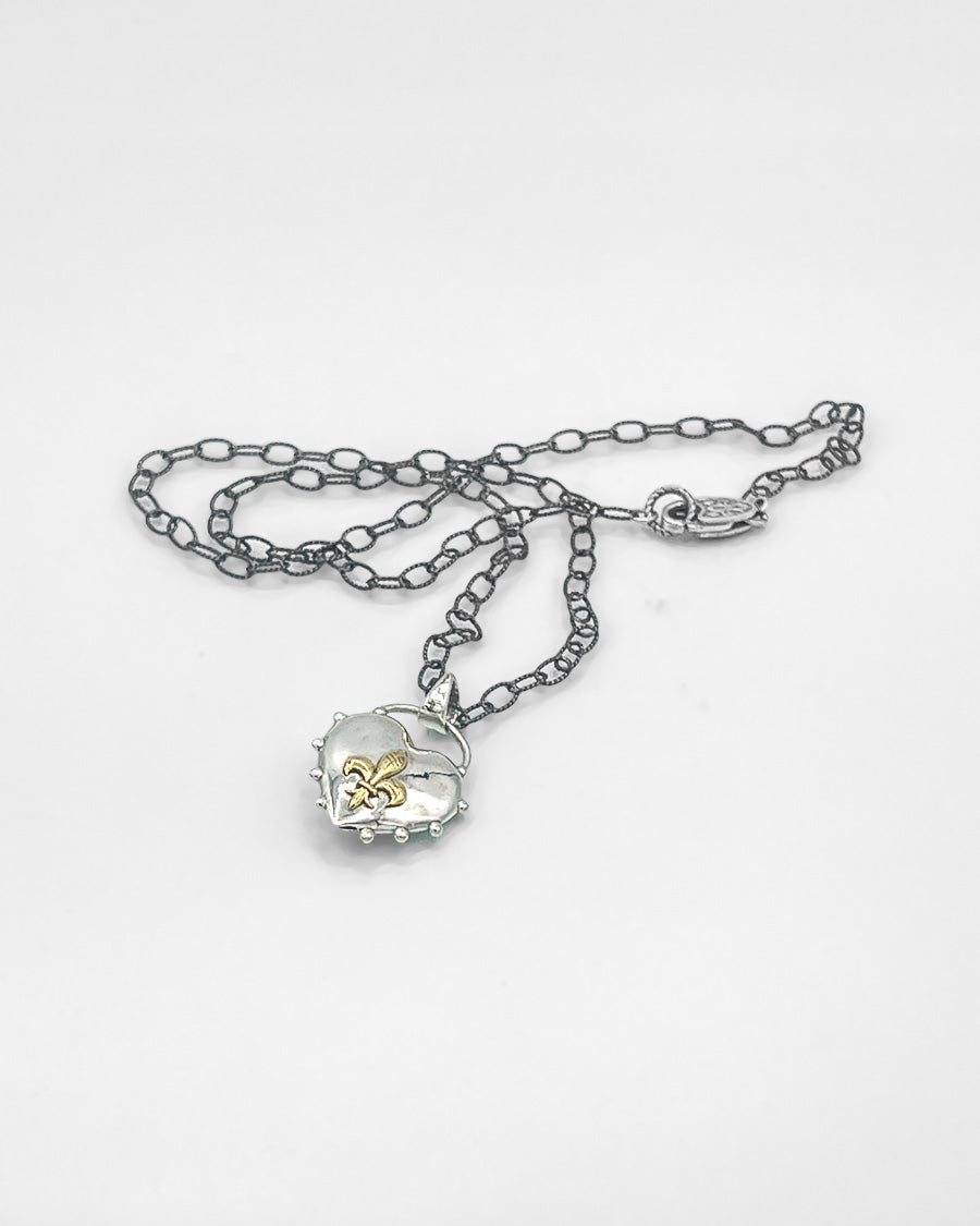 Sterling silver heart pendant adorned with a brass fleur de lis on sterling silver chain of various styles and lengths.